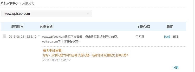 百度降权? 首先想到的是网站是否被百度惩罚。当时查了一下,除了百度收录只收了首页之外,网站关键词排名都还不错,而且站内优化做的都还不错,并且没有heimao,文章也都是原创,所以首先排除网站被百度降权。 低质索引? 我每天都会听一些在线培训的免费公开课,所以我也在课堂上提出了这个问题给培训老师。他提出了一个概念低质索引,也就是高质量页面会放在高质索引,低质量的会放在低质索引。但对于他这个观念我是极力否认的,虽然收录少,但是我认为是在收录时间范围内的,就算页面是低质量的,也不可能没有快照页面。 禁止抓取快照设置? 快照不能点击之后,我也第一之间在百度站长工具中做了投诉,也很快得到了回复,如图: 站长工具投诉 站长工具反馈为:反馈问题为网站自身设置问题。百度知道很多答案也是这样,于是我就检查了一下网站设置,但是并没有做任何限制百度快照的设置,所以基本上这种可能也可以排除了。 频繁投诉快照 最后忽然想到会不会是因为我频繁的使用百度站长工具进行快照投诉。记得网站刚收录的时候,每天都会查网站的收录和排名情况,一旦发现百度快照日期不同步就要进行百度快照投诉,几乎每天都有投诉,极有可能就是因为这个原因才不显示百度快照。带着这个疑问我也查看了360的快照情况,发现是能够查看快照的,这说明,网站本身是没有问题的。 虽然知道了是因为频繁投诉百度快照导致的,但依然没有一个有效的解决办法。好在快照并不会影响网站的收录和排名情况,所以我也就不去操作,时间稍长一点,百度快照就会自然恢复了,如果有类似情况的站长也不用担心,百度快照是对网站排名没有一丁点影响的,完全可以不用去处理。